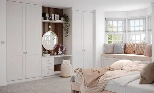 Don't worry if you've got an awkward space, we love that stuff! We build all kinds of custom wardrobes - from wardrobes over a stair bulkhead to wardrobes with sloping backs, or perhaps wardrobes with a TV in the middle or even overbed wardrobes - these are all things we take in our stride! Make a beautiful space by opting for a fitted wardrobe with dressing table - get ready in style and everything is part of the same aesthetic style.